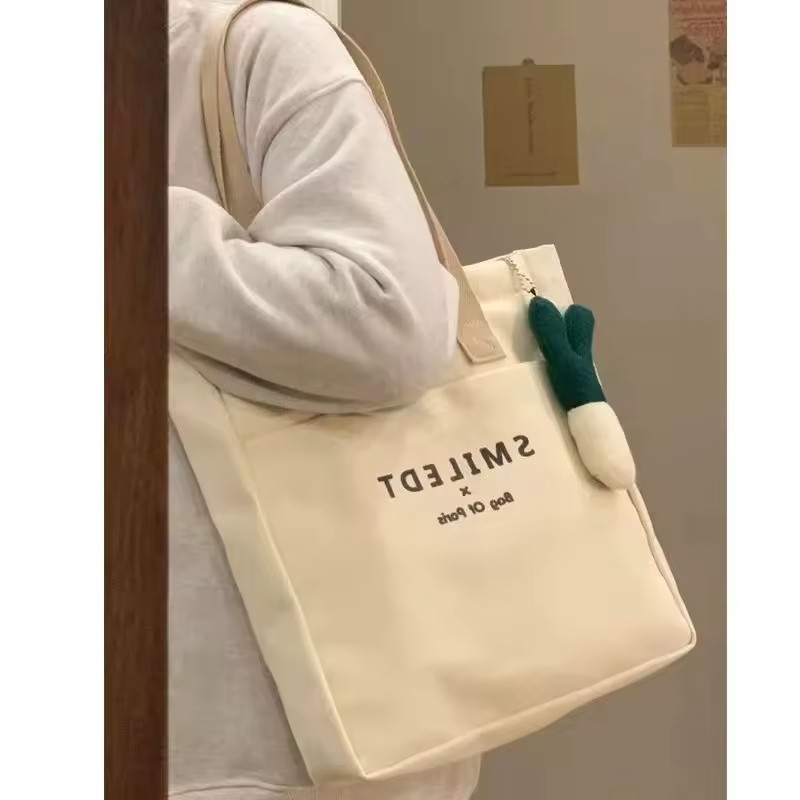 New Style Fashion Custom Letter Canvas Bags Women Shoulder Cotton Canvas Tote Bag with Pocket for Class and Work